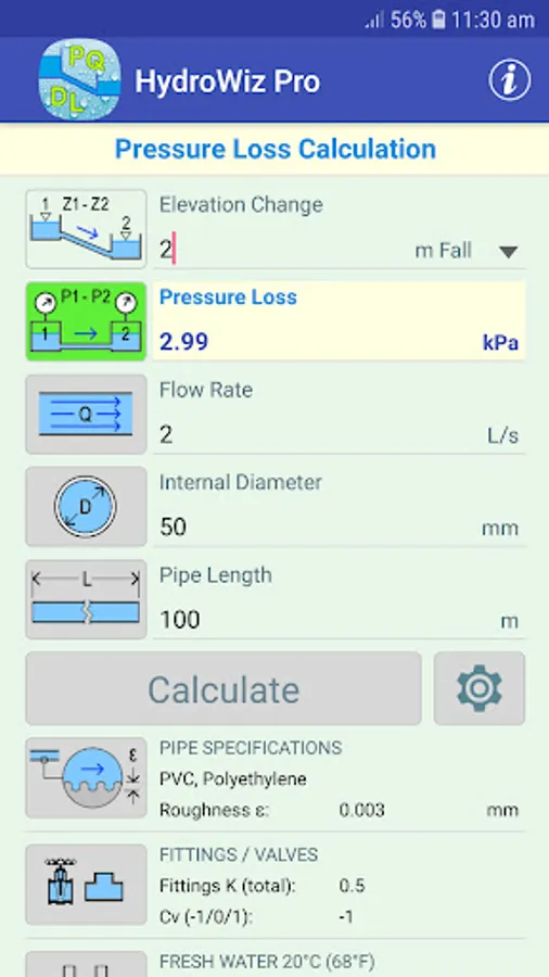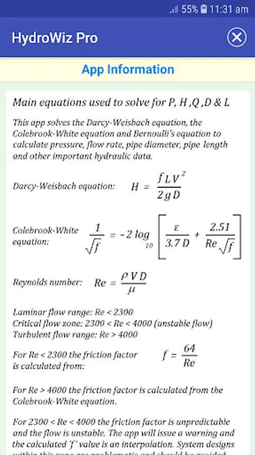 HydroWiz was designed to be a versatile tool to help engineers find solutions to common pipe flow hydraulics problems allowing them to perform quick "what if?" calculations easily. It would also be useful to anyone working on simple water transfer projects involving pipes. The app solves the Darcy-Weisbach equation, the Colebrook-White equation and Bernoulli's equation to perform a range of hydraulic calculations on a single length of pipe between two known points.