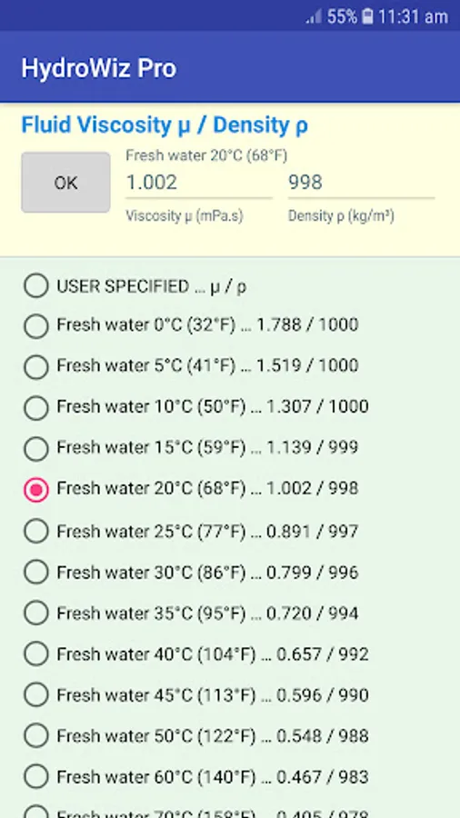 • Fluid properties from a range of fluids including fresh water and sea water at different temperatures.