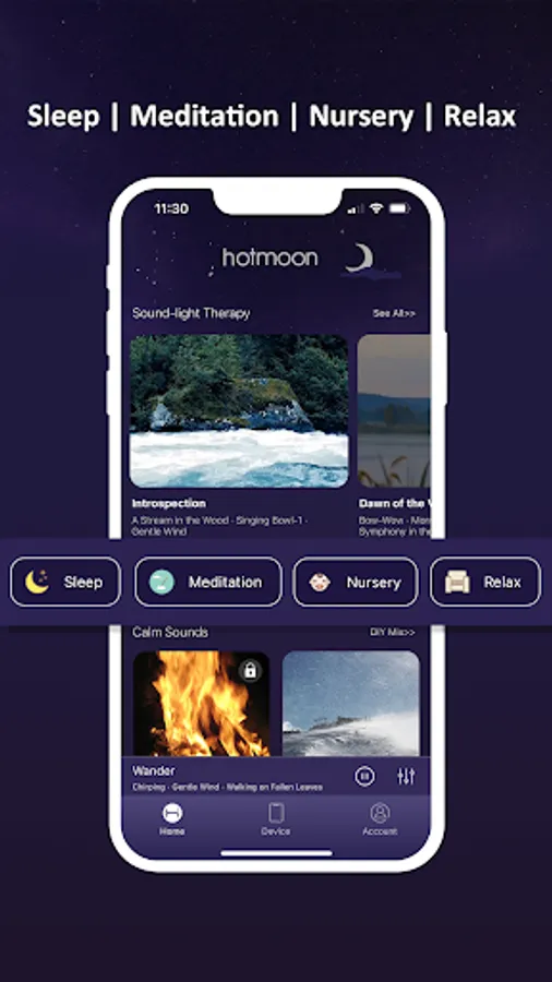 Hotmoon initiates unprecedented sleep therapy compounded of lights and sounds, improving sleep in a safe and personalized way. You can mix any 3 from 100+ sleep-inducing sounds to get the scene you feel good for inner peace.