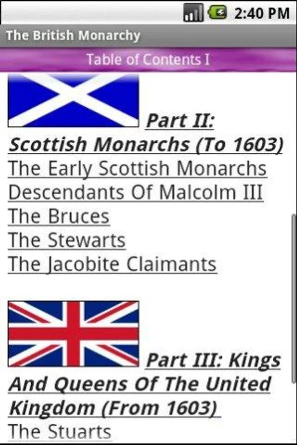 A searchable 1,000-year history of the British Crown contained in this one app. Bios of every monarch from Offa & Kenneth I through Elizabeth II; overviews of each house; Years they reigned, who they killed to get there! What's an OBE? I didn't know, I'm American! Now I do and you can too!!