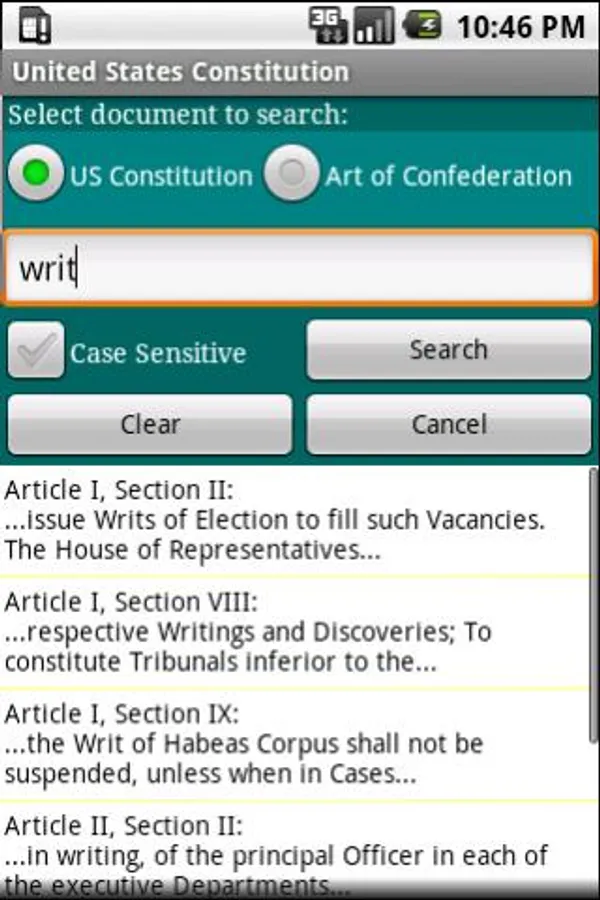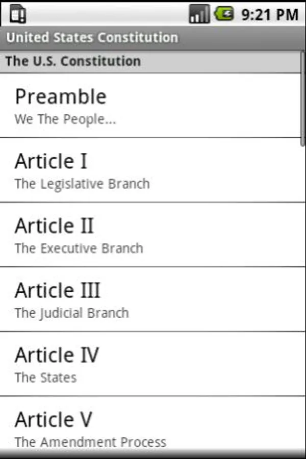 This application is for all you constitution geeks. I wanted something that was easier to navigate than other applications I've seen, had a real table of contents broken down by articles, sections and amendments, didn't treat the first ten amendments like one giant inseparable document, was searchable, and contained other related documents, ideas, and trivia like the Declaration of Independence, Gettysburg Address, The Virginia Plan, The Great Compromise, ratification dates, and anything else I could think of that floats in that new Constellation of Liberty the Framers were shooting for two centuries ago.
