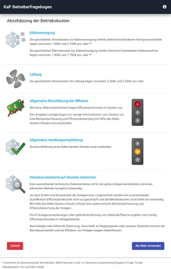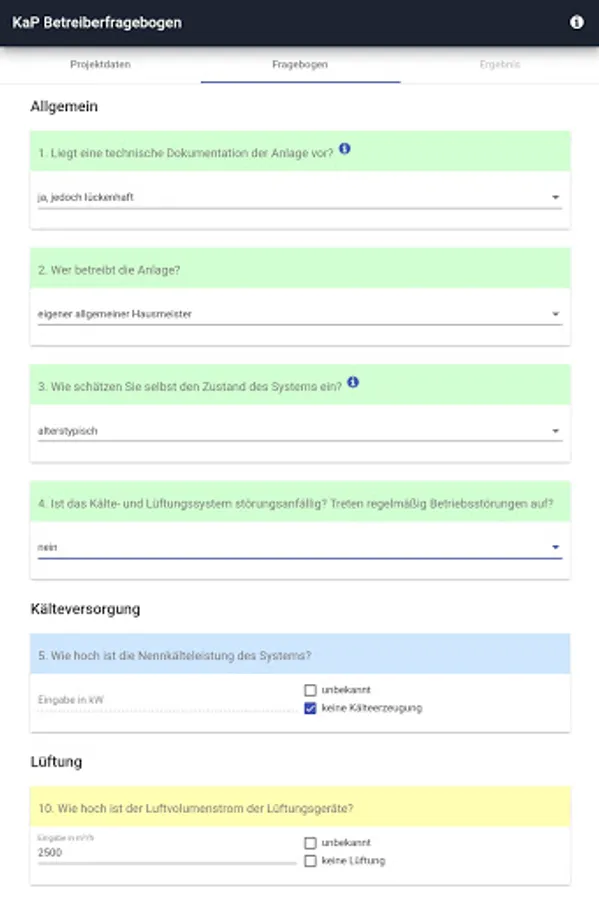 The KaP operator questionnaire serves as a qualitative initial assessment of the efficiency of a refrigeration and ventilation system. In this way, efficiency potentials in an existing system can be quickly and easily uncovered and possible obstacles to getting started with a detailed efficiency analysis and system optimization can be overcome. The creation of the KaP operator questionnaire was funded by the Federal Ministry for Economic Affairs and Energy.
