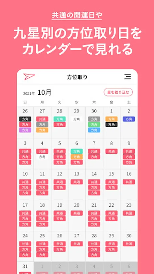 In Orientation, the monthly good luck date for each nine stars is displayed on the calendar, showing the direction and efficacy.