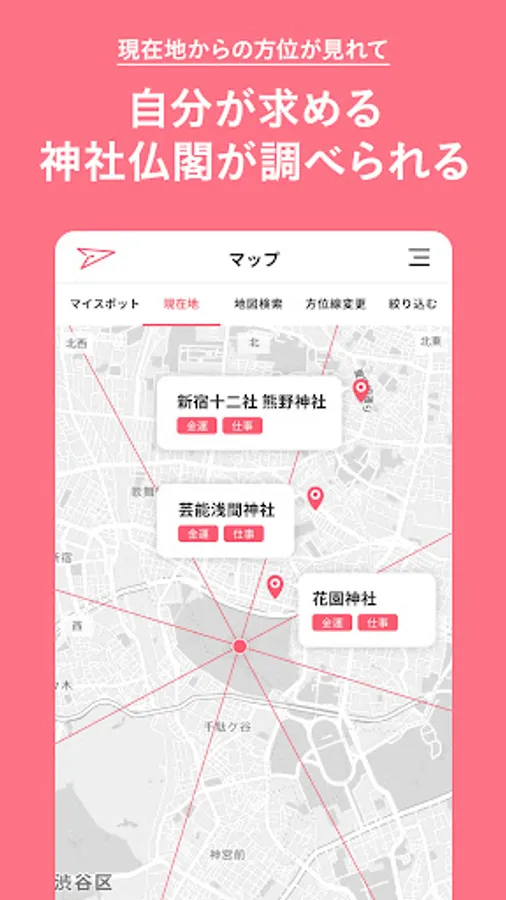 Shrines, temples and power spots that receive good energy from all over the country are displayed on the map, and it is possible to search by efficacy.