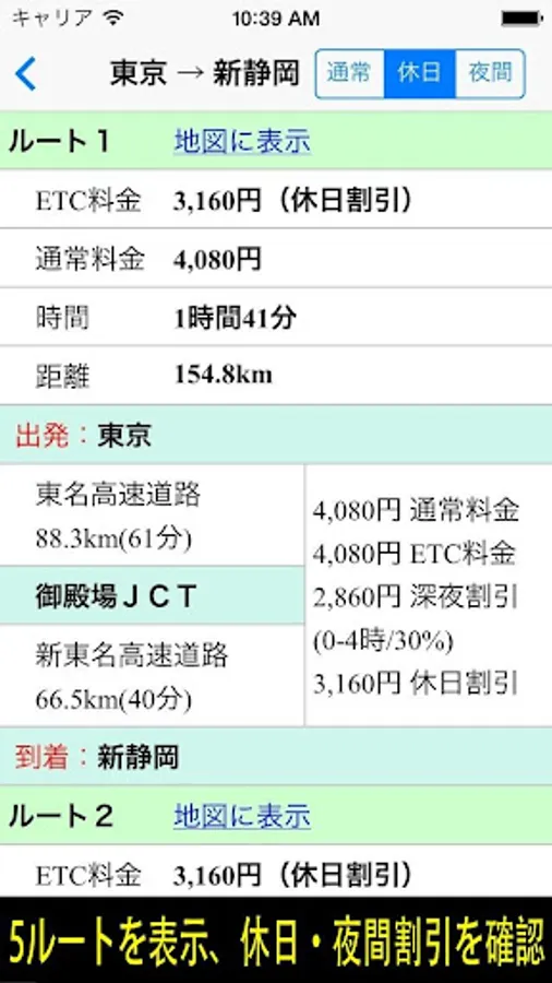 -3ルートまでの検索結果でETCの通常料金、休日割引、夜間割引を確認できます。