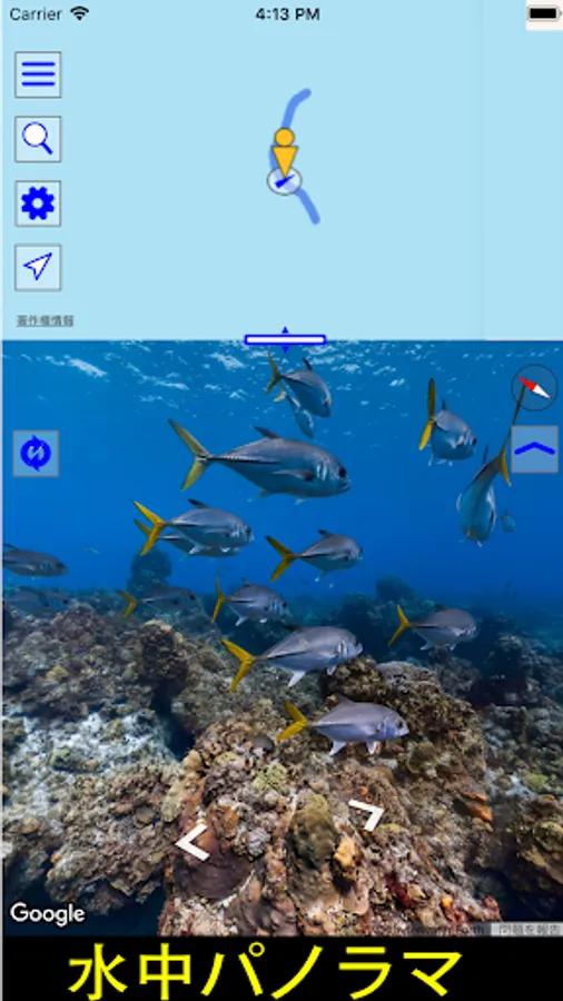 ・海上のマーカーをタップすると水中パノラマ画像を表示します。