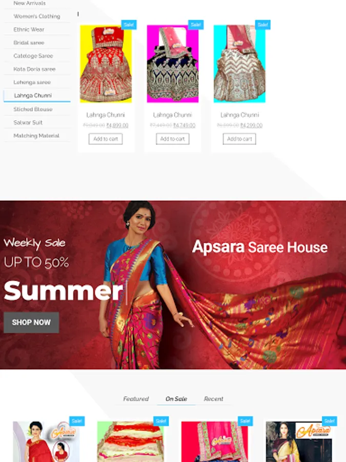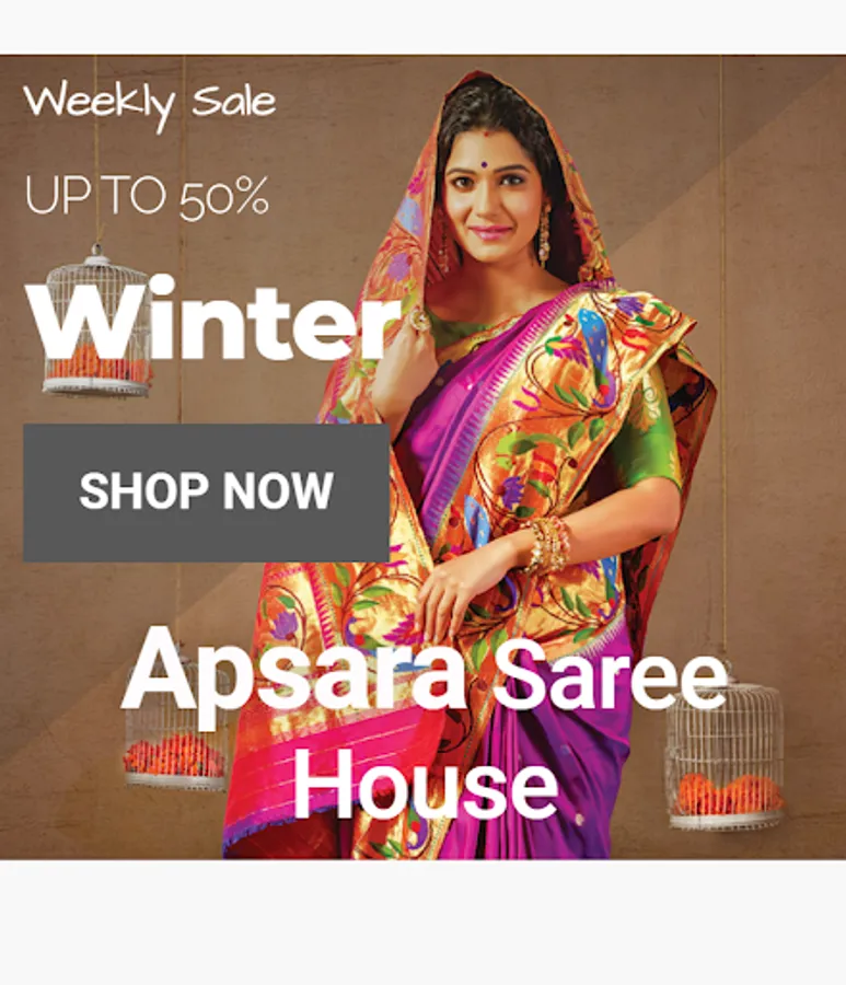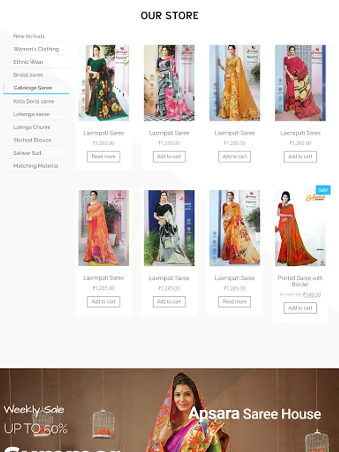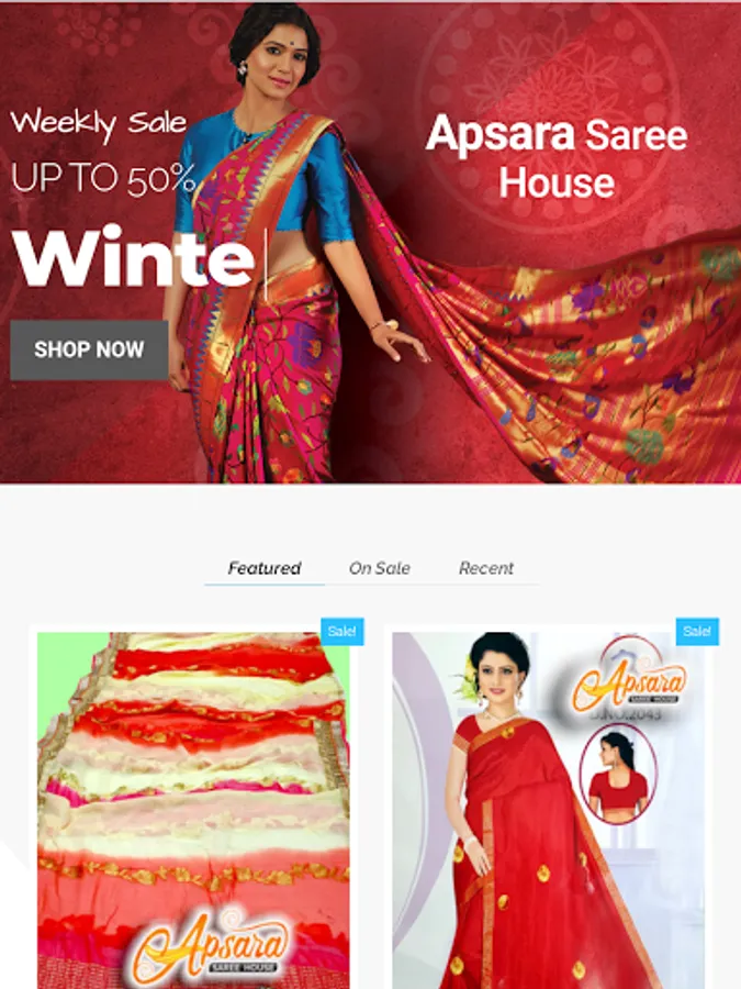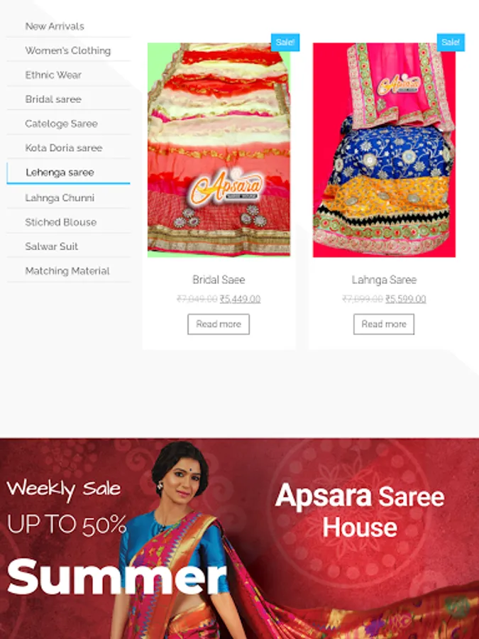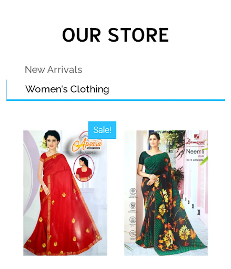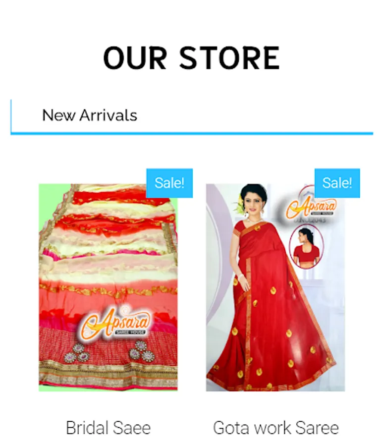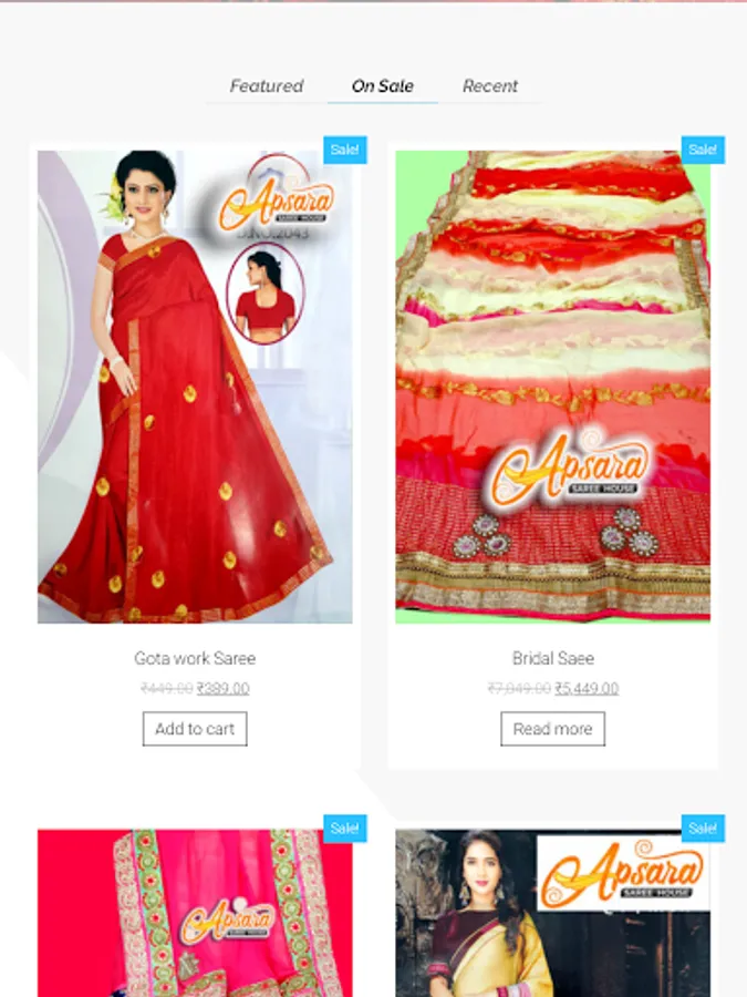 This app includes all saree types including fabric , excellent designs, party wear suits , normal saree and many more.