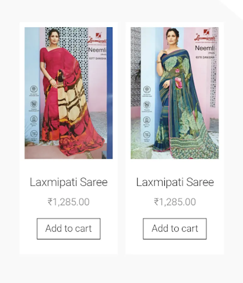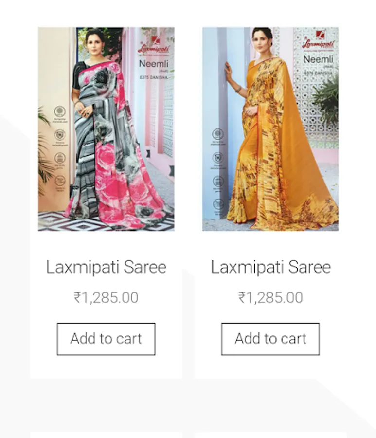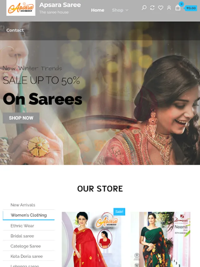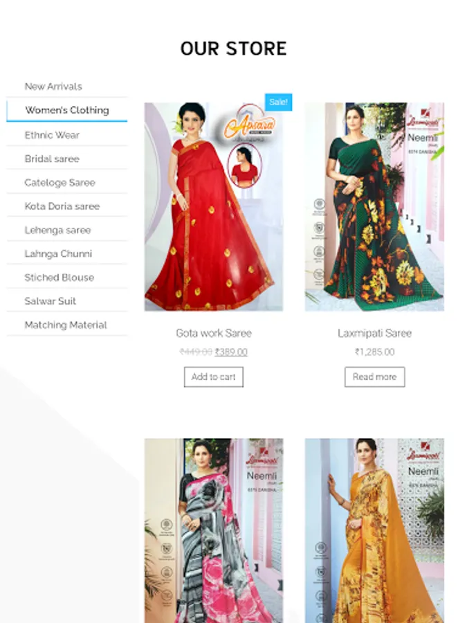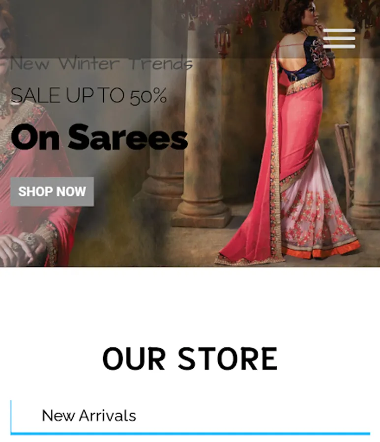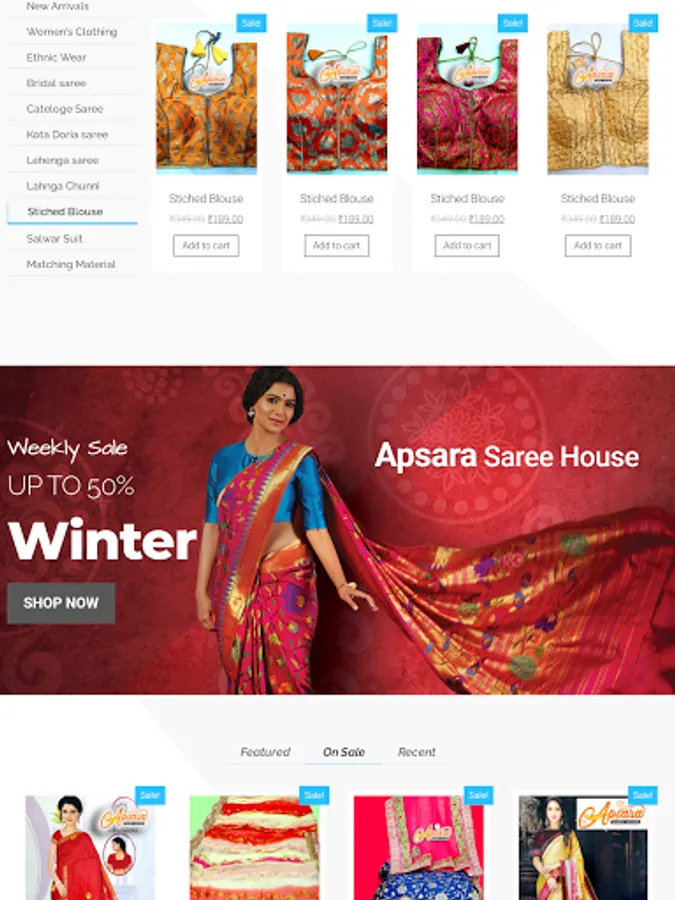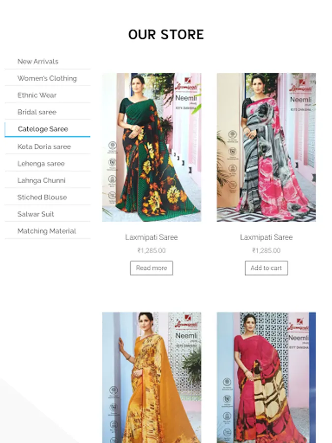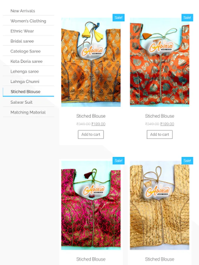 This app includes all saree types including fabric , excellent designs, party wear suits , normal saree and many more.