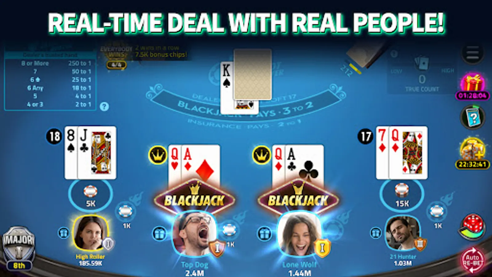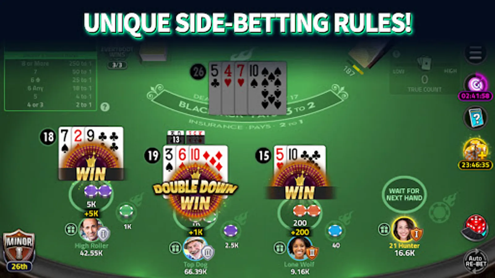 β Place side bets to claim the Jackpot and win up to 1000X more in blackjack wins!
