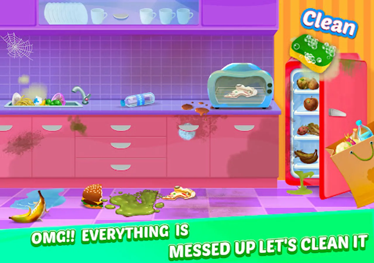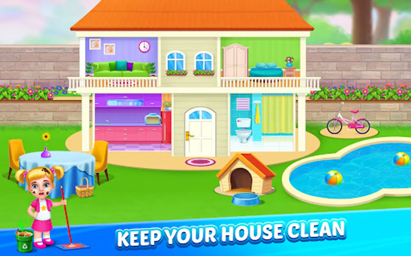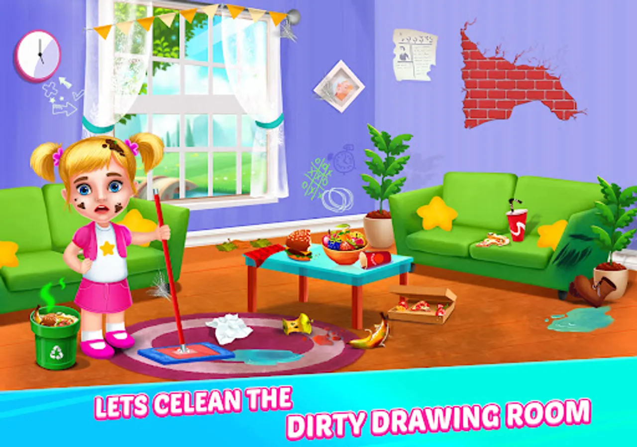 Play house cleaning game and fix the messy house. Clean up the drawing room, kitchen, toilet, bathroom, fix the cycle, clean the garden, pet house, and swimming pool. Play small puzzle game while cleaning your room. Have tons of fun playing in the playground and house cleaning games! Learn how to clean up your room, do laundry, clean the bathroom and wash the dishes.