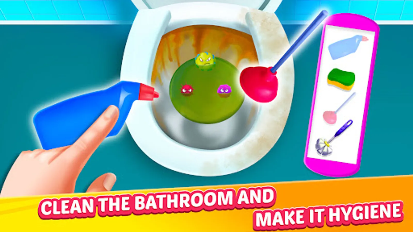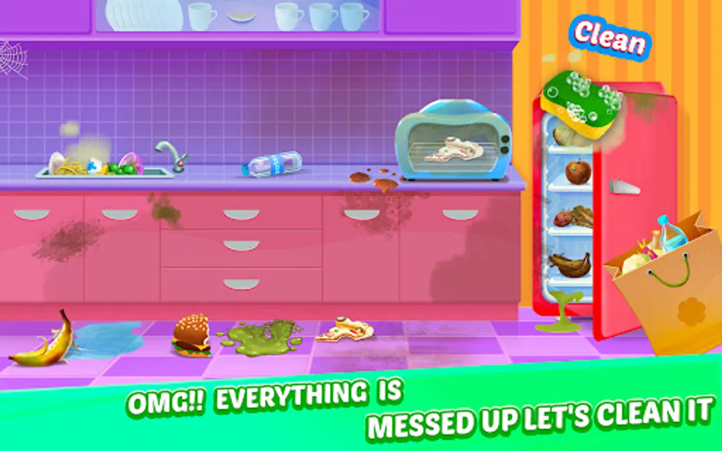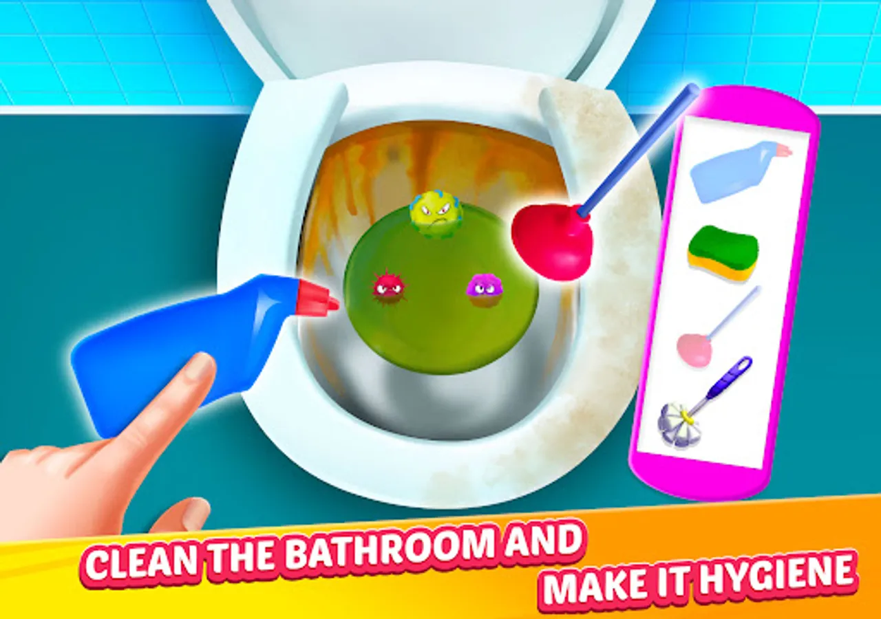 Play house cleaning game and fix the messy house. Clean up the drawing room, kitchen, toilet, bathroom, fix the cycle, clean the garden, pet house, and swimming pool. Play small puzzle game while cleaning your room. Have tons of fun playing in the playground and house cleaning games! Learn how to clean up your room, do laundry, clean the bathroom and wash the dishes.