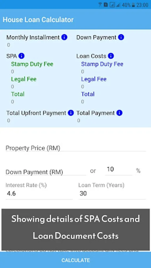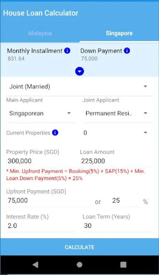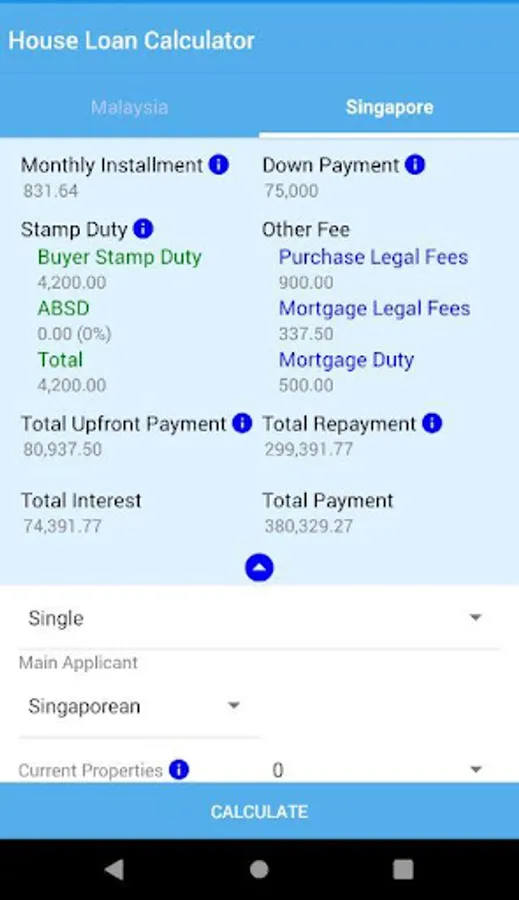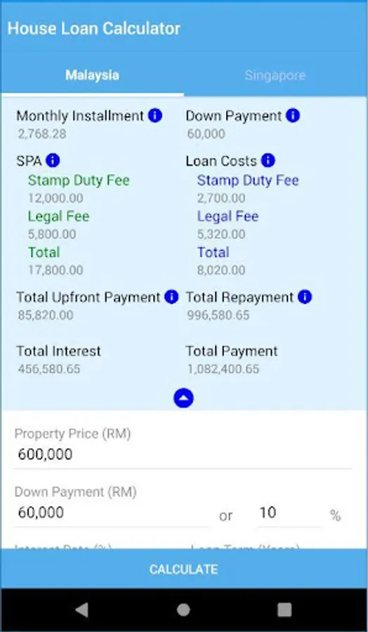 HousIng Loan Calculator Malaysia & Singapore is a loan calculator for calculate monthly installment, SPA Cost, Loan Document Cost, down payment, total upfront payment and total payment for buying a property/house.
