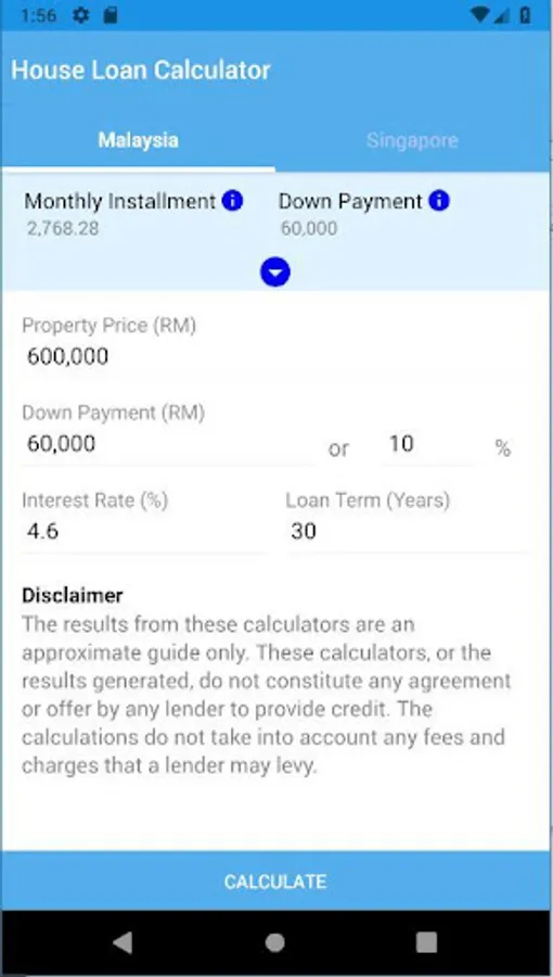 The results from Housing loan calculator Malaysia and Housing loan calculator Singapore are an approximate guide only. This calculator, or the results generated, do not constitute any agreement or offer by any lender to provide credit. The calculations do not take into account any fees and charges that a lender may levy.