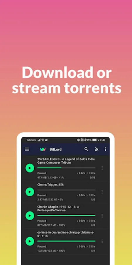 Stream video and audio torrents (almost) instantly. No need to download the whole torrent. Send the video to your Chromecast - even while streaming (requires a good connection)