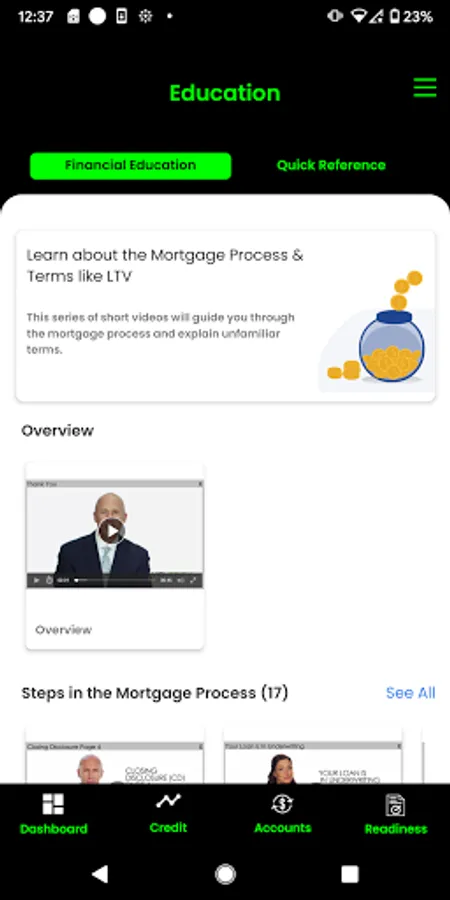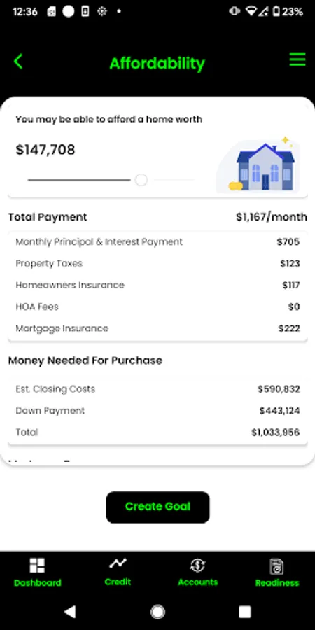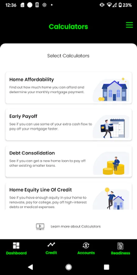 Work with your financial partner or institution to best prepare you for home ownership by planning for a down payment, establishing reserves, managing your debt to income ratio, improving or maintaining your credit, loan scenarios through our calculators, establish your projected loan to value, and more. Visit the readiness assessment in your app to see a snapshot of your credit overview, debt to income ratio, cash reserves, employment, down payment and sales price.