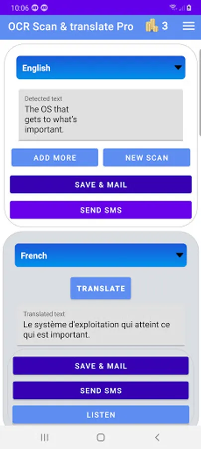 The detected text could be also translated to 11 langugages : english, german, french, spanish, italien, arabic, thai, turkish, chinese, russian and indonesian.
