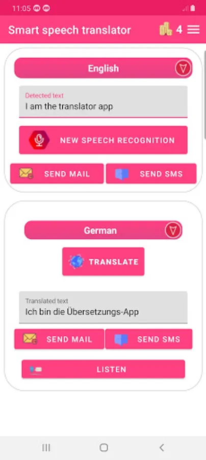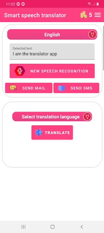 Smart speech translator is an application that detect your speech and translate it in written text. The detected text could be sent by email or sms and it could be also translated to many languages such as english, french, arabic, spanish, german, italian, indonesian, turkish, thai, chinese and russian.