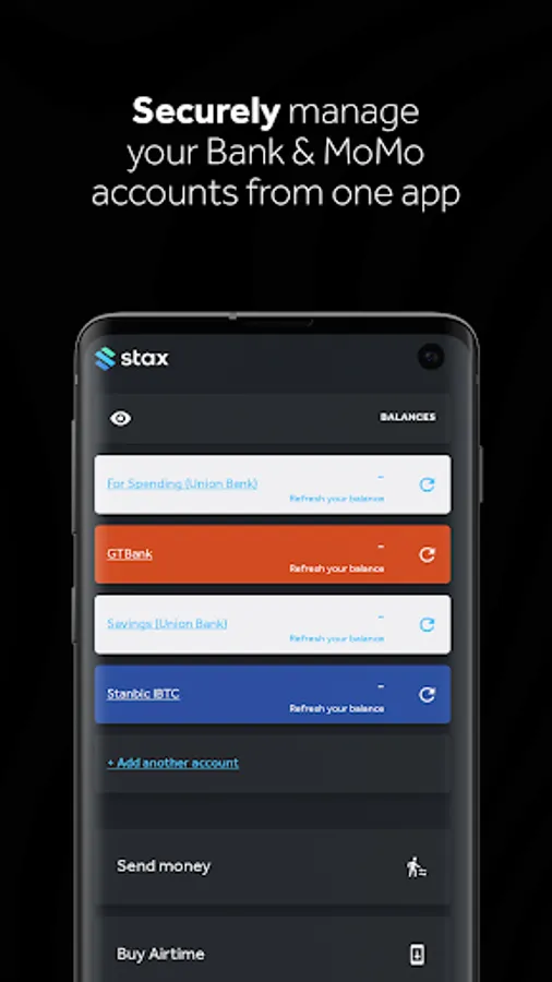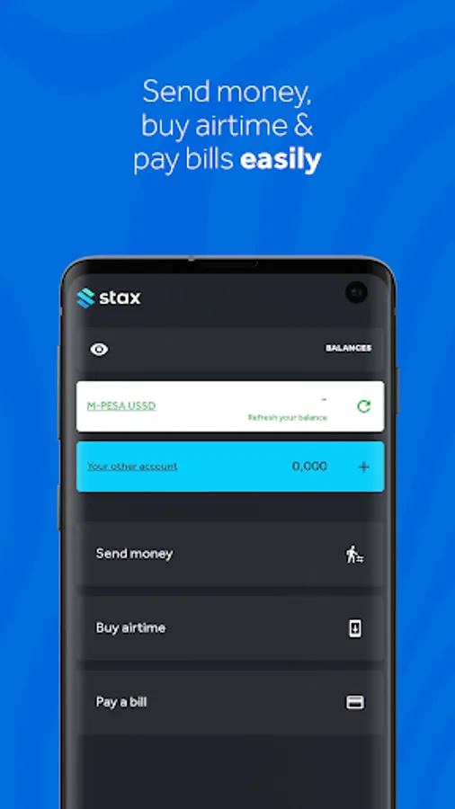 - Stax uses 2-factor authentication by design for every single transaction. Every time you refresh a balance, send money or buy airtime, you need your unique SIM card and your bank or mobile money PIN.