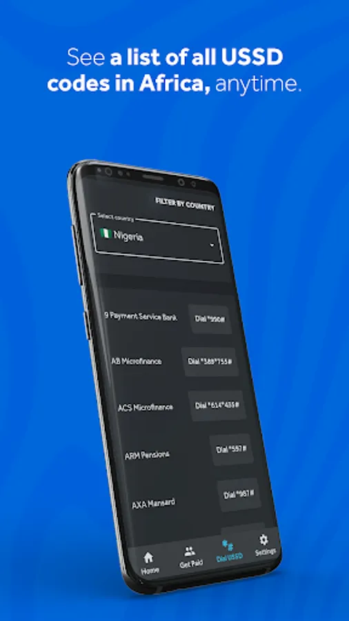 - USSD library: Access our in-app USSD library where you can search, view and dial USSD codes of all banks and mobile money operators in Africa.