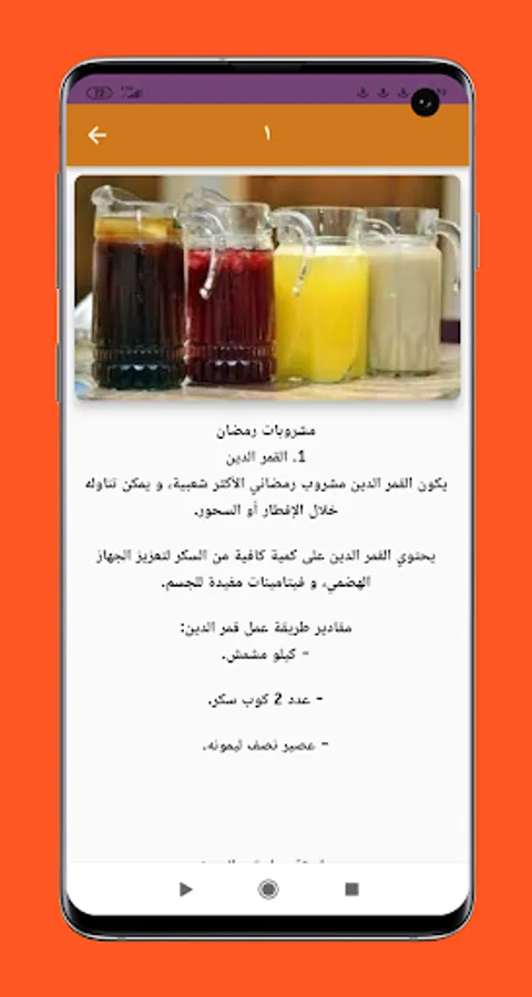 Ramadan drinks: Drinks are often served during the holy month of Ramadan, due to the great need of the fasting person to replace the fluids he lost after a full day of fasting, especially if the month of Ramadan is one of the hot summer months, as drinking cold drinks at breakfast time works to compensate for the lost fluids and hydrate the body. The most famous of these drinks are tamarind drink, Qamar al-Din drink, khashaf drink, gulab drink, and many others.