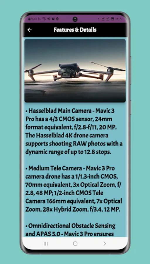 DJI Drones Mavic 3 Pro has a 4/3 CMOS sensor, 24mm format equivalent, f/2.8-f/11, 20 MP. The Hasselblad 4K drone camera supports shooting RAW photos with a dynamic range of up to 12.8 stops.