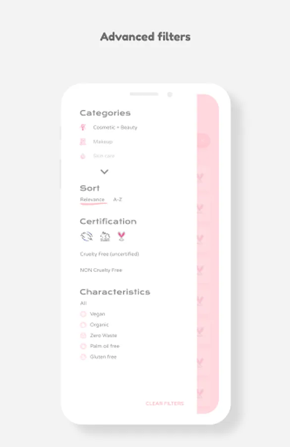 • Filters: filter the list by categories, cruelty-free certificates and characteristics (vegan, organic, zero waste, palm oil free, gluten free...)