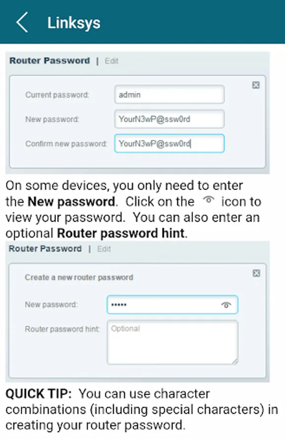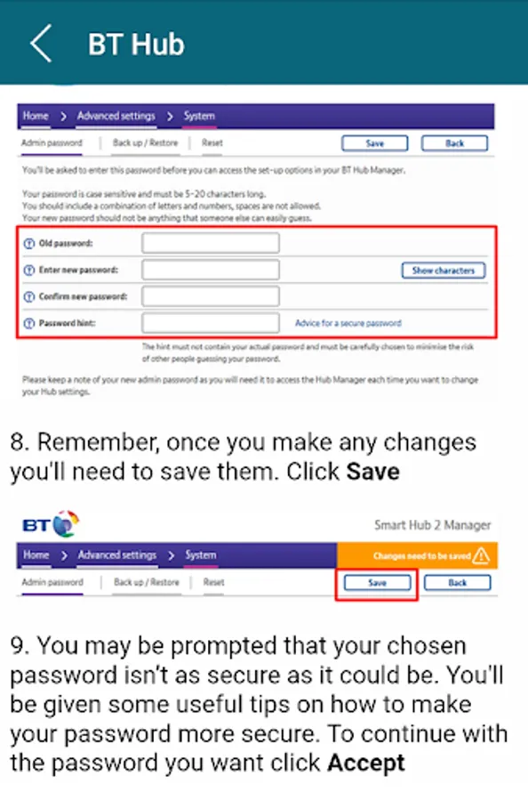 Router brands showing how the administrator password is changed in our mobile app: BT Hub, Verizon, Tp link, draytek, linksys, motorola, huawei, d link, arris, belkin, en genius, trendnet, thomson, netgear