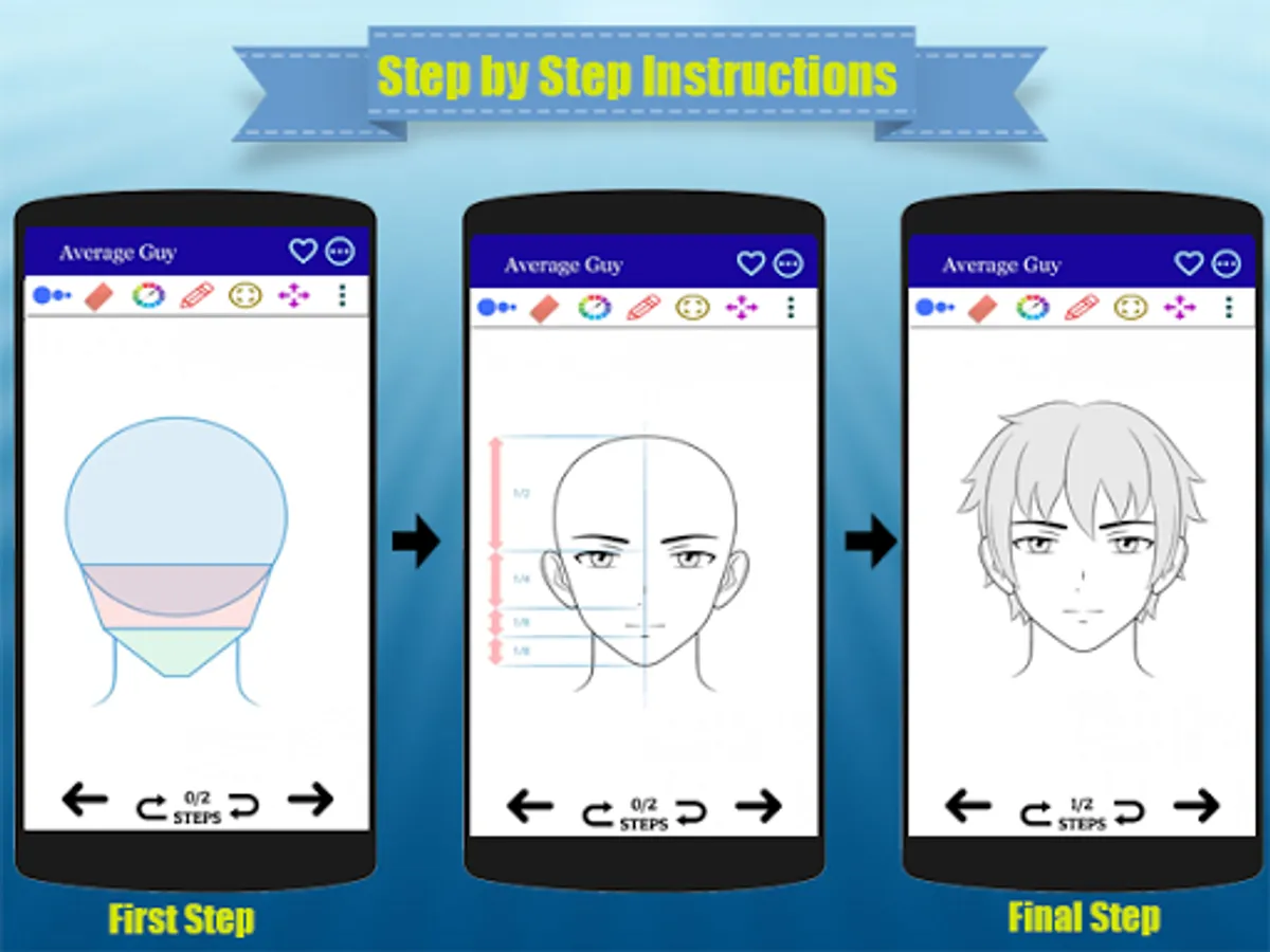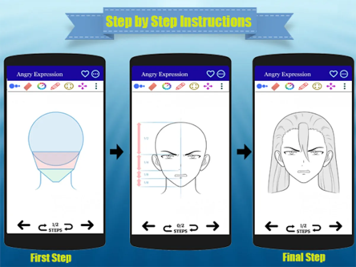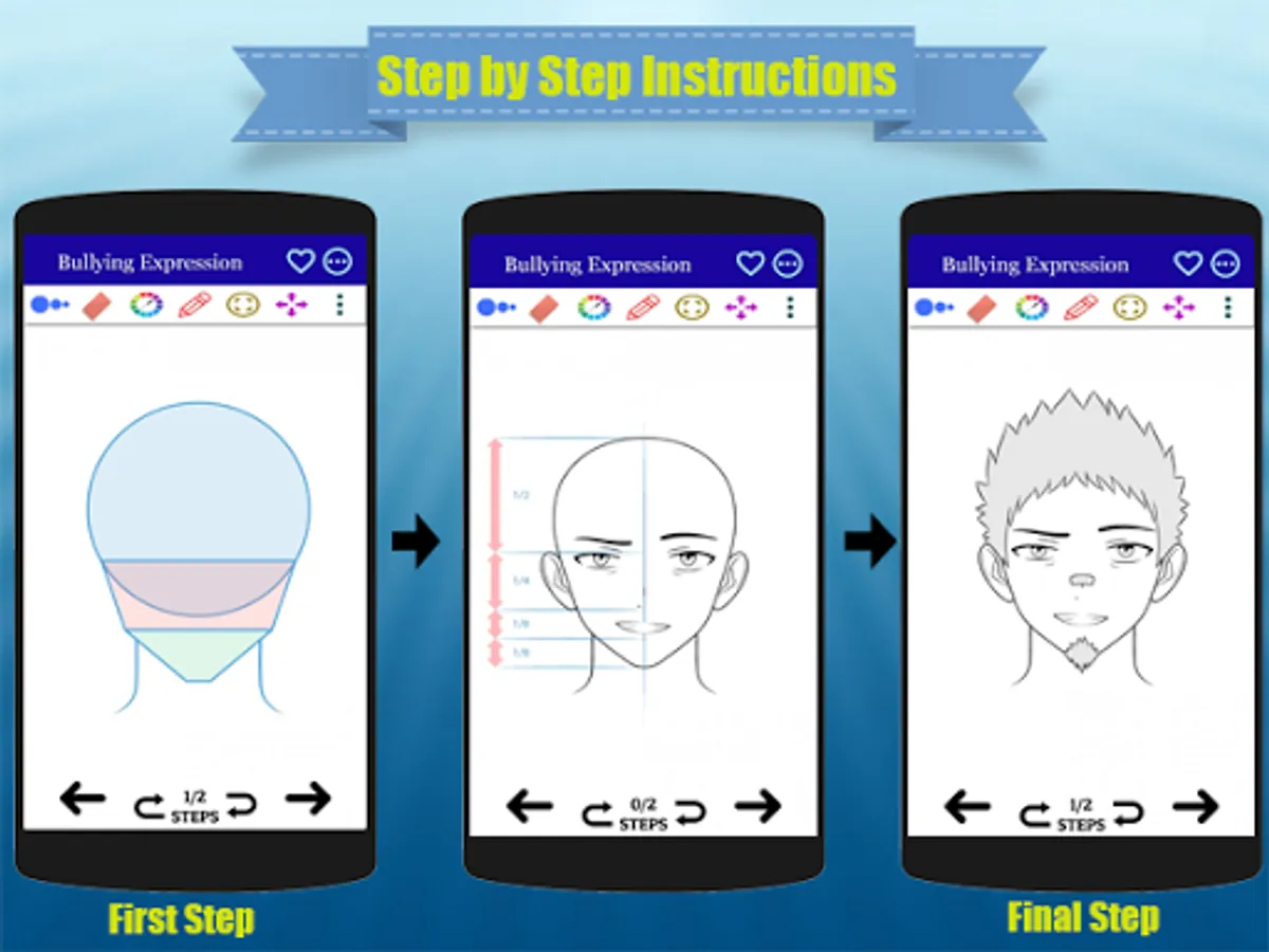 This how to draw anime step by step app will help you learn how to anime male characters with various face expressions.