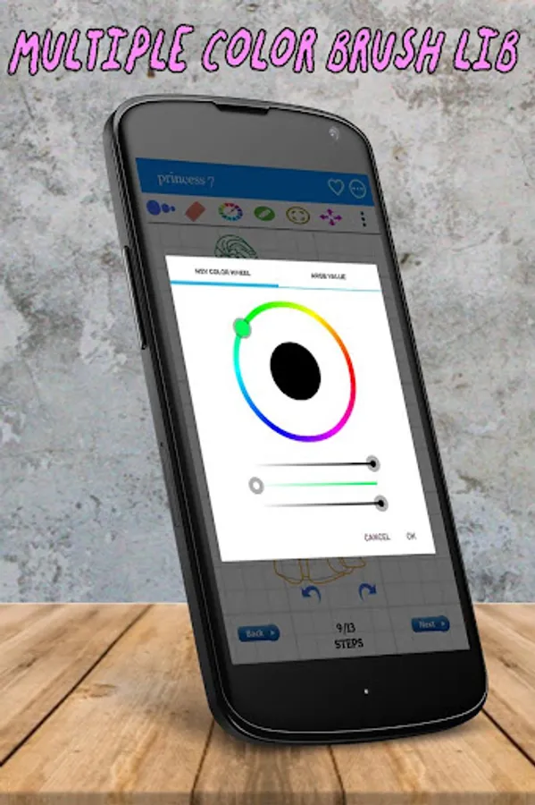 Draw with different brushes, using large color palette. Follow the line step by step or create new ones directly from the application and save your drawings into gallery and share with friends