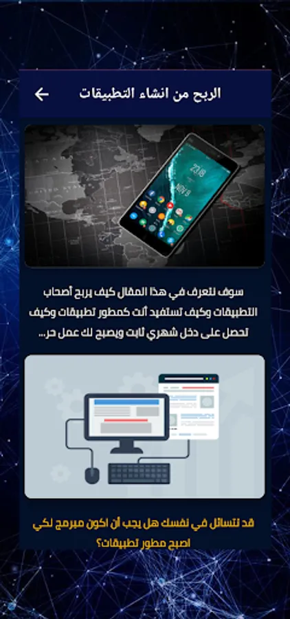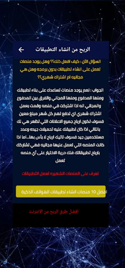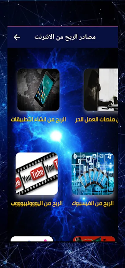 We remind you of some ideas to earn money and become an independent business owner, including: We teach you how to create an application and profit from it through advertisements without being a programmer and on the platforms of making ready-made applications, not only profit from advertisements, but several ways and ideas we mentioned open the way for you to free work and we explained the topic of profit from YouTube Completely, so that we collected for you several ideas to open channels and start profiting from them, and we explained the way to profit from file upload sites, or if you want to profit from followers on social networking sites. We also mentioned some online projects for profit, and the best source of profit is to perform tasks for business owners and many other ways and multiple sources You will find it in the application.