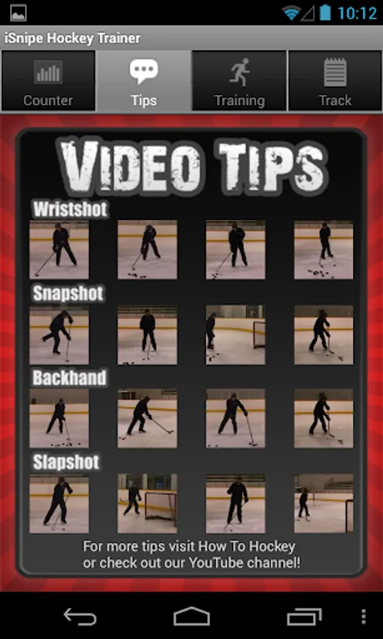 The iSnipe app is a training tool that will help hockey players improve their shot. The player will benefit from video teaching tips, a shot counter, two training tools, and a tracking page