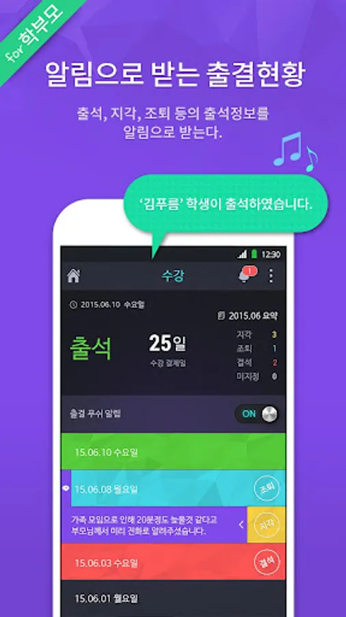 학원 등원 시마다 스마트폰 푸시알림으로 자녀의 출석정보를 받아볼 수 있습니다.
