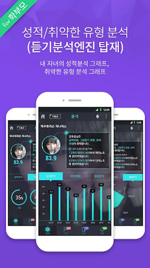 자녀의 숙제응시 현황과 성적을 그래프로 한눈에 파악할 수 있고 성적 및 취약한 유형을 매우 정확하게 분석하여 제공합니다.