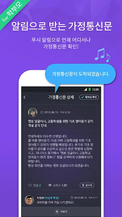 스마트폰 푸시알림으로 언제 어디서나 가정통신문을 확인할 수 있습니다.