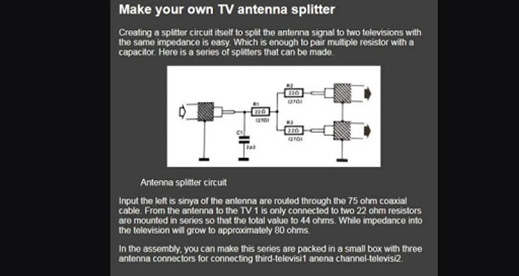 With a material that is easy to get in the market and with the cheap price we had been able to have the TV antenna assembly itself, with quality and outstanding results even sometimes better than the TV antenna that are sold in the market that we use for our TV."