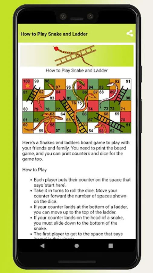 This application is a guide to Play Snake and Ladder, a complete guide to playing the game.