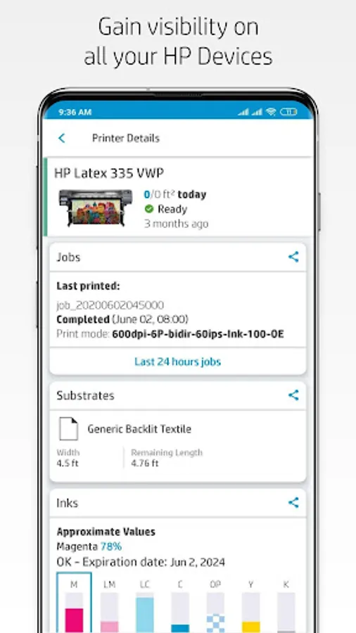 You’re never far from your site with the HP PrintOS Mobile app. Take advantage of convenient fleet monitoring capabilities and access to real-time information. Gain insight and make data-driven decisions. See what real control feels like.