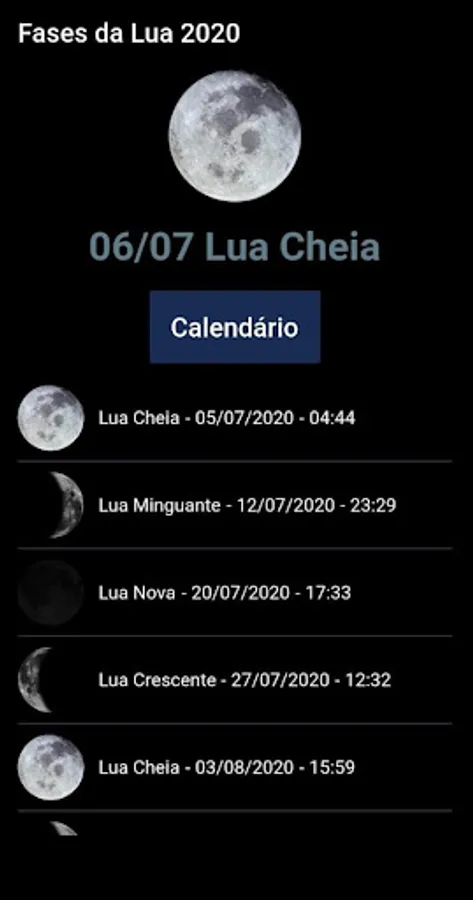 With an easy, friendly and objective interface you can check the current moon phase and all the next ones in the year 2020