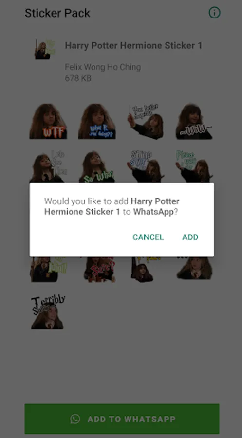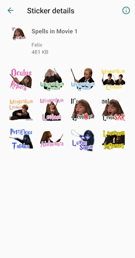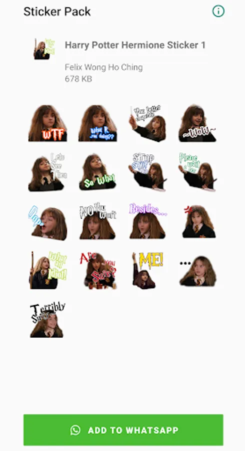 All for free. You can download your favourite pack from our app and send stickers to your friends easily from WhatsApp. The app features Hermionie Granger, Harry Potter, Ron, Snape, Dumbledore, Draco Malfoy, etc.!