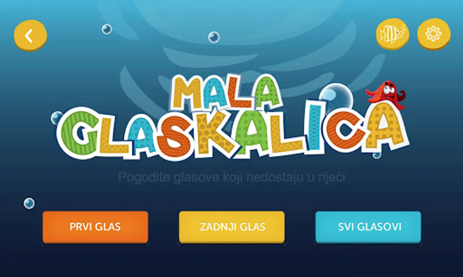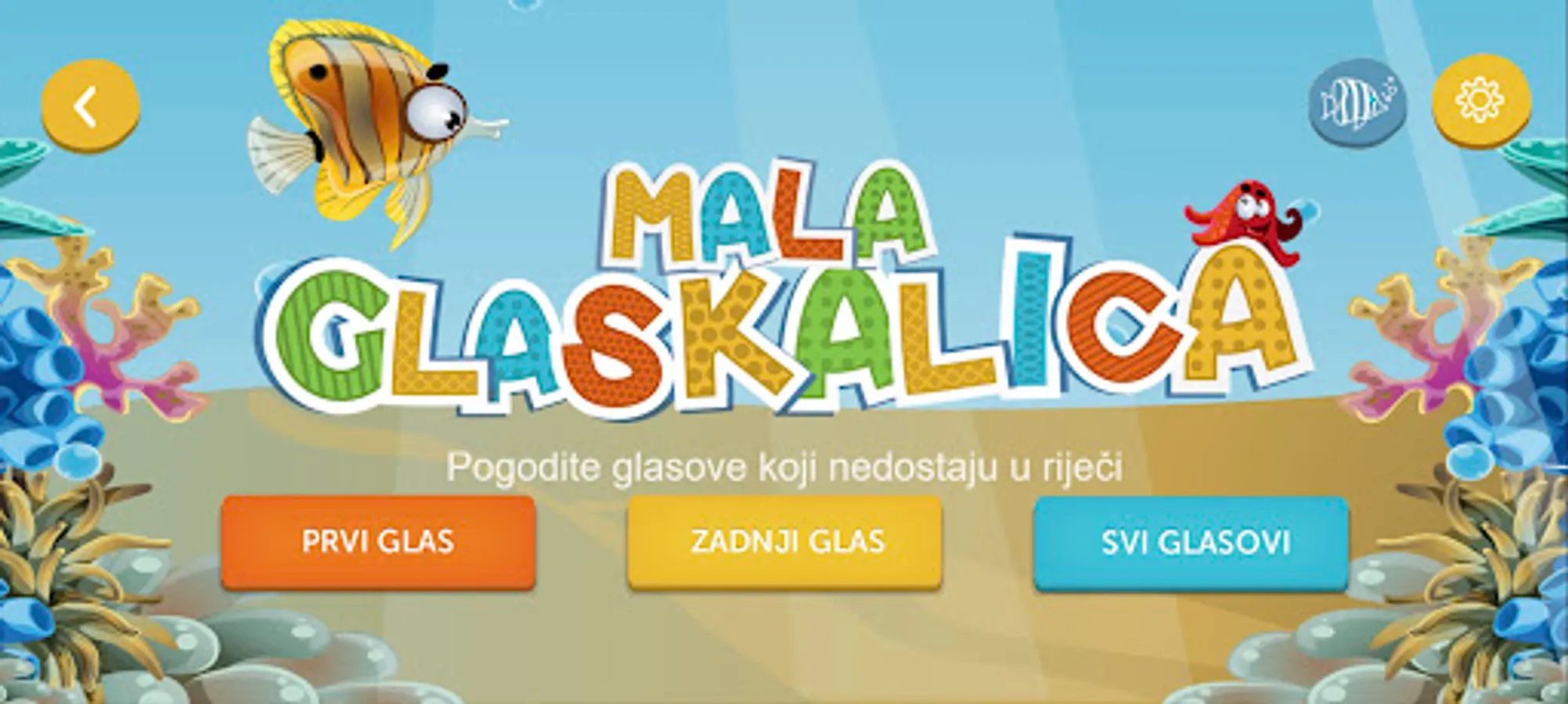 The ICT-AAC Mala Glaskalica application helps to master phonological awareness, which is one of the basic pre-skills of reading. In this sense, it includes recognizing the first, last or all sounds of a word. In order to enable gradual learning, the application differentiates the tasks according to the complexity of the words. In total, users have at their disposal six possible "difficulties" of the game in which they guess the votes on more than 100 selected words. Next to each given word, users are shown a thumbnail representing a term that corresponds to the given word. It is possible to pronounce the whole word as well as to spell the word word by word. ICT-AC Little Glaskalica is a specially adapted version of the popular application ICT-AAC Glaskalica according to the requirements of the Association of OKO Parents and the Croatian Community for Down Syndrome.