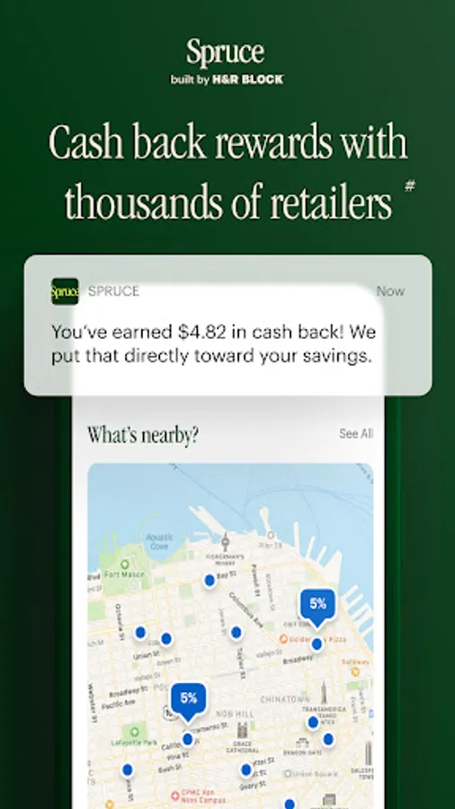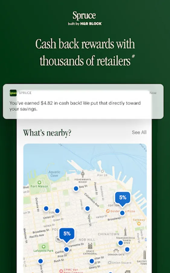 # Spruce Rewards powered by Dosh. Offers vary by user, merchant location and offer period. Check the app for offers. Cash back will be deposited in your Savings Account. See Spruce Rewards powered by Dosh Terms for details.