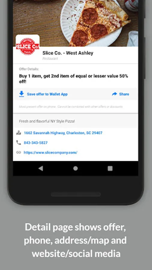 The Coupons and Rewards Cards you save appear automatically on your phone when you enter the merchant's business. Redeem your coupons and earn rewards points right from your phone. Simply tap 'Save offer' and 'ADD' it to your compatible digital wallet app (WalletPasses recommended see full list below). Easy to use, nothing else to carry as all of the merchants' coupons and rewards cards are in your Charleston Saves app. Each merchant's detail page contains convenient quick access info. A simple tap allows you to call the merchant, see their location on a map or visit the merchant's website or social media.
