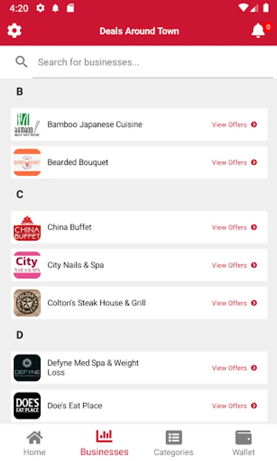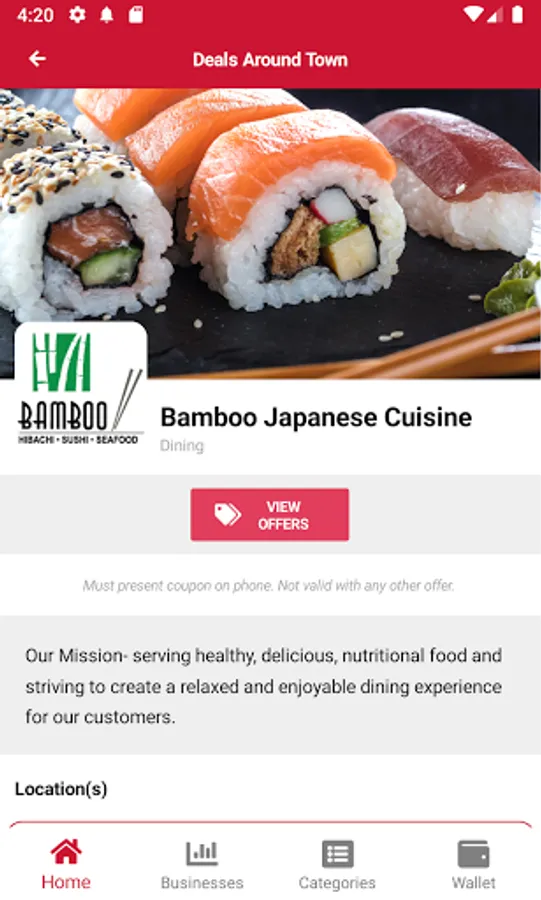 Simply go to any businesses page, tap 'View Offers' and 'ADD to Wallet' to save the offer(s) in the wallet. Easy to use, nothing else to carry as all of the merchants' coupons are in your DEALS AROUND TOWN app. Each merchant's detail page contains convenient quick access info. A simple tap allows you to call the merchant, see their location on a map or visit the merchant's website or social media.