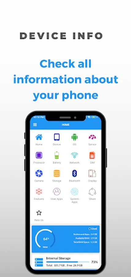 Device Info is the best way to find out all the details of your phone. With a clean and easy-to-navigate interface, Device Info shows you everything you need to know about your device: CPU, RAM, battery usage, storage, and more. It's simple. It's powerful. It's Device Info.