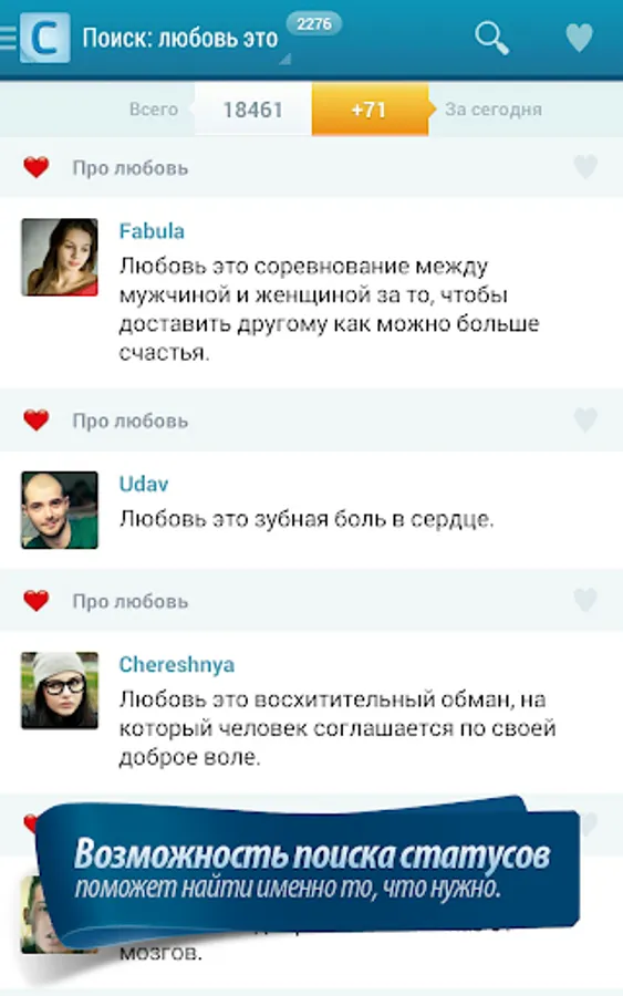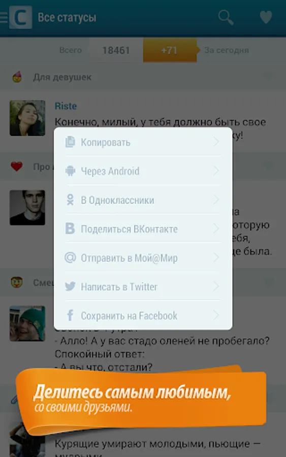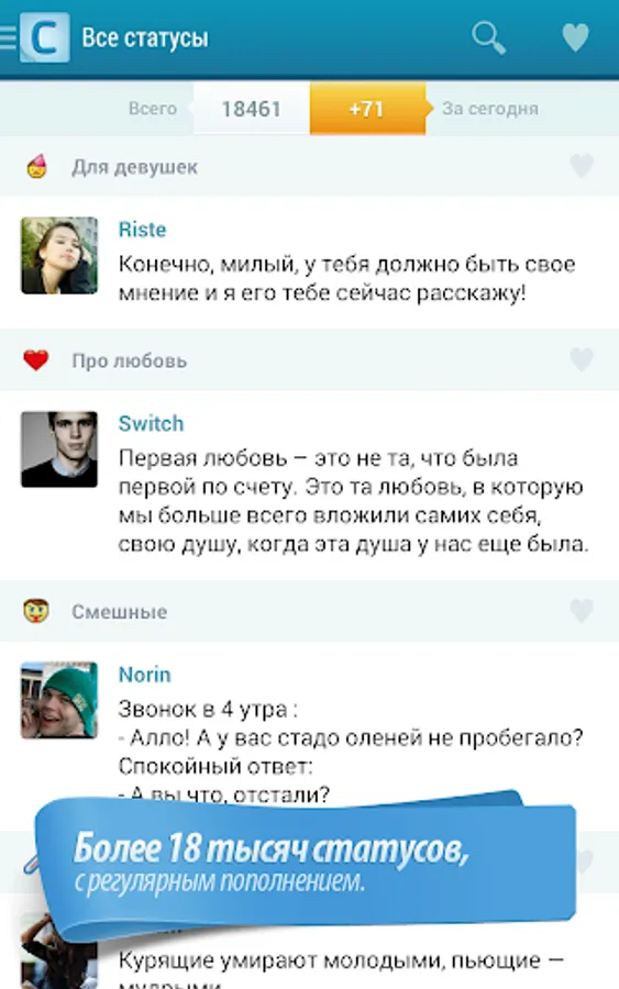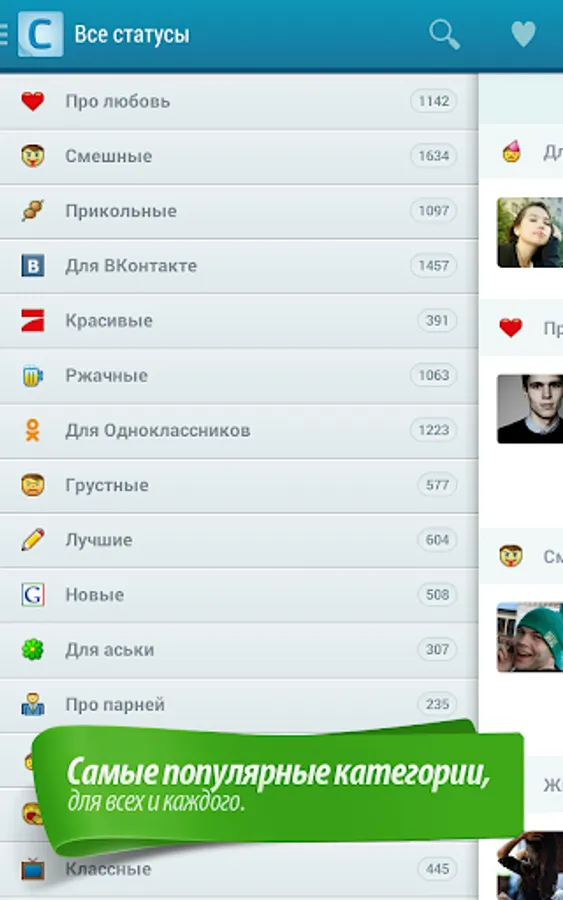➋ More than 40 categories, including such as: statuses for VKontakte, Odnoklassniki, or ICQ, Fun, About Love, Funny, Sad, Beautiful, Pro or Pro guys and girls this is not a complete list.