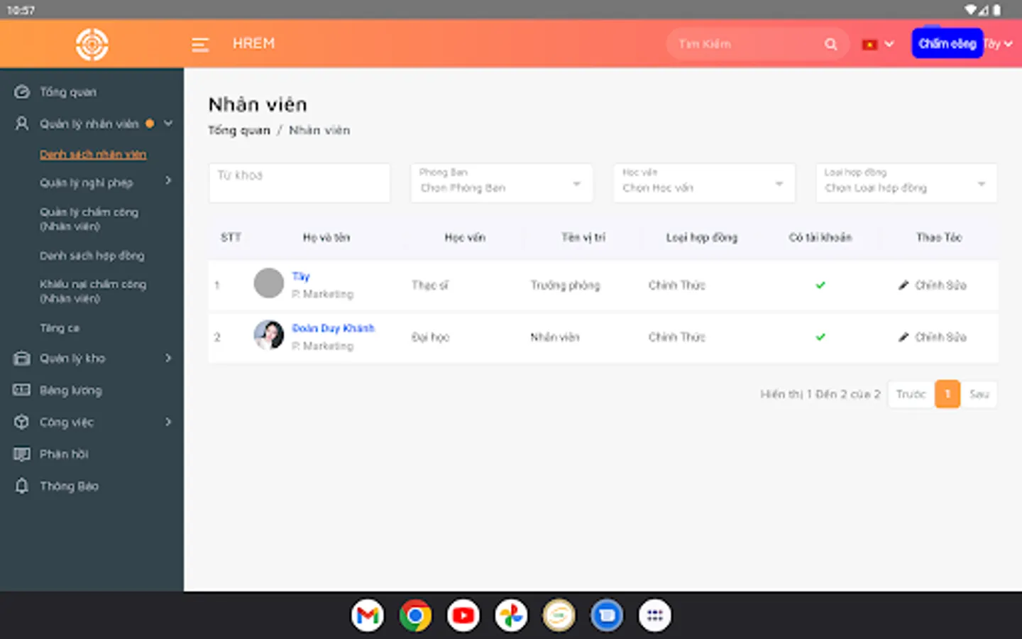 Online HR management software by Khanh Hoi provides a comprehensive and synchronous human resource management solution on one system. The software is possessing many new and highly specialized features such as: Time attendance from mobile phones, support for sending bulk payroll via email....