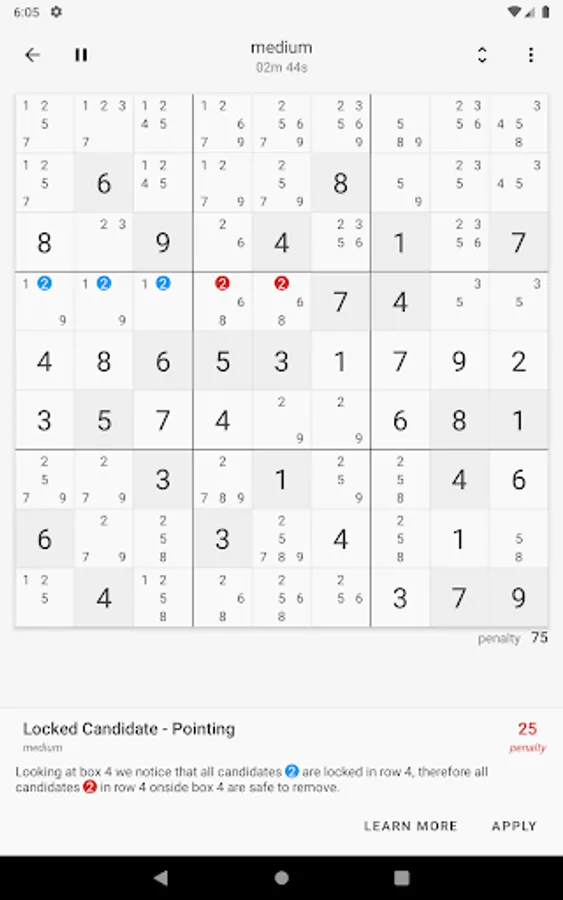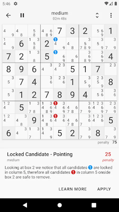 During any game you can simply use the 'get clue' button to get the best next step in solving the puzzle complete with live highlights and a short explanation of the technique used to deduce the step. Want to learn more about it just hit the 'learn more' button and you will find a detailed explanation complete with examples.