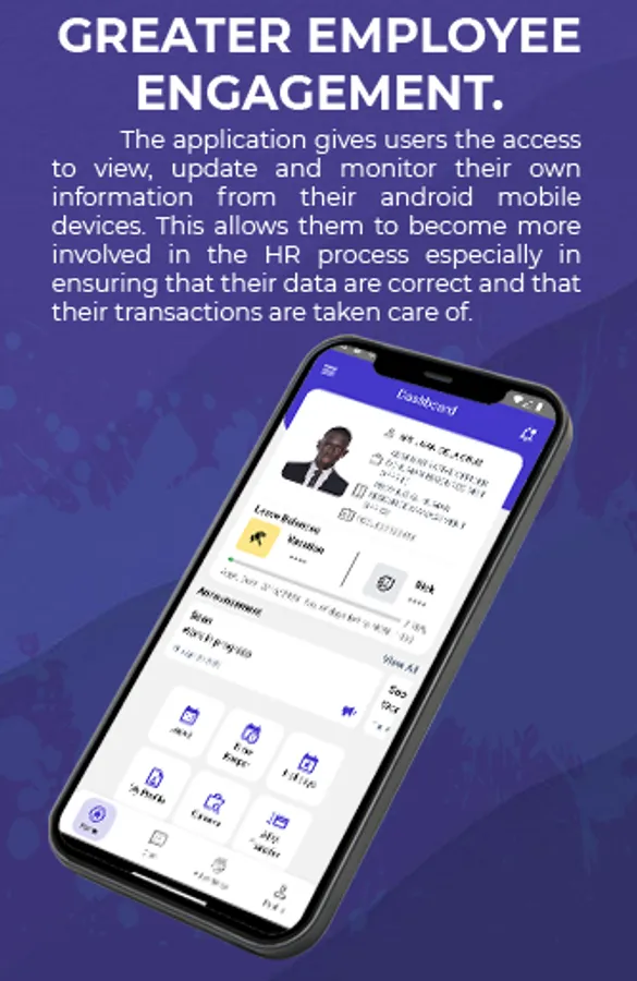 The application gives users the access to view, update and monitor their own information from their android mobile devices. This allows them to become more involved in the HR process especially in ensuring that their data are correct and that their transactions are taken care of.