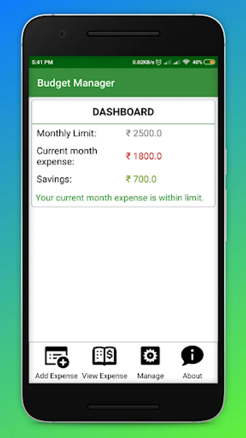 Android application that helps you to keep a track on your monthly expenditure and analyze your expenses and savings. Set a certain monthly expenditure limit and this app lets you know whether your expenditure is above the limit set by you or not. Also you keeps record of all your expenses.
