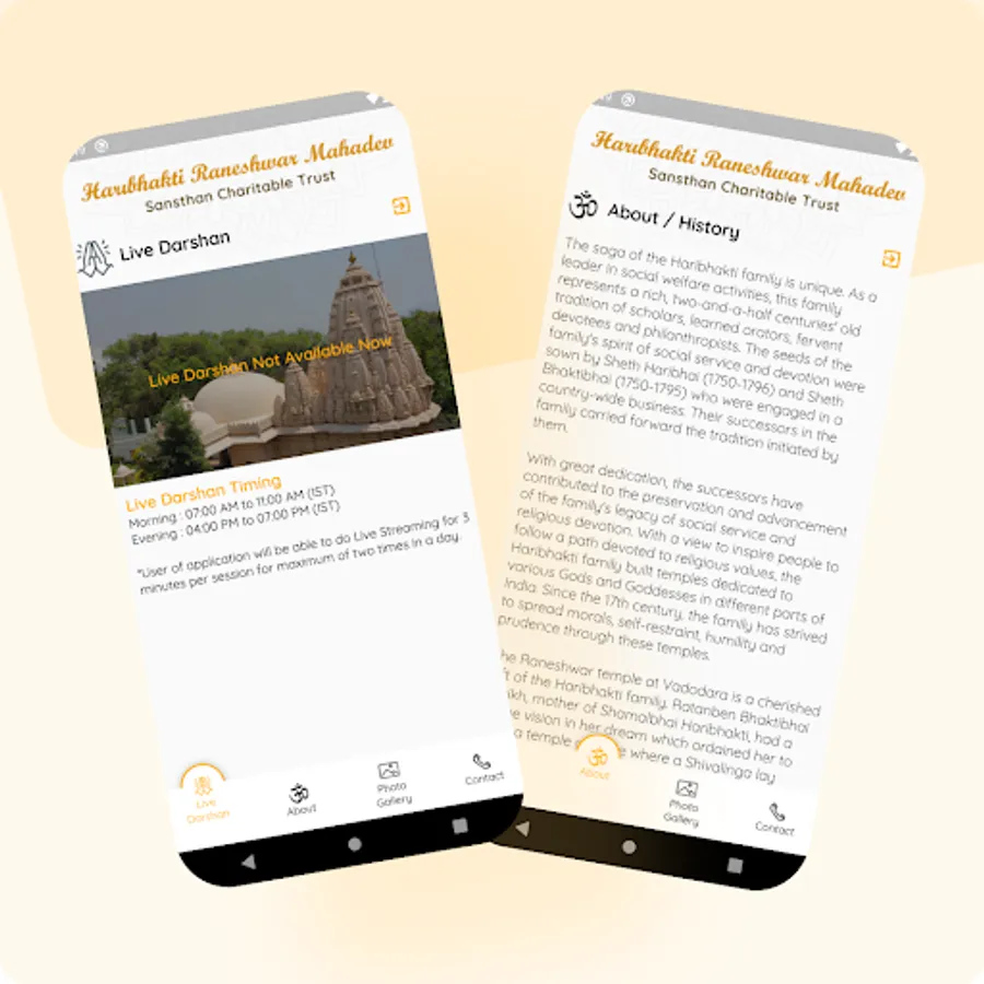 Hari Darshanam : Official App from Haribhakti Raneshwar Mahadev Sansthan Charitable Trust - Vadodara, Gujarat. Now you able to do Live Darshan daily for two times in a day. Also, provided History, Photo gallery and Contact details of HRMSCT (Haribhakti Raneshwar Mahadev Sansthan Charitable Trust).